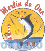 El logotipo conformado por la denominación MERLÍN DE ORO escrita en letras características y la figura de un pez merlín saltando, con una corona y tres estrellas sobre su cabeza y cinco gaviotas sobrevolando sobre la orilla del mar, un faro, dos palmeras, una bandera peruana, en los colores amarillo oro, rojo, verde, blanco, azul claro y celeste, negro y gris; conforme al modelo adjunto