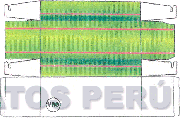 La caja empaque de forma rectangular en color verde con líneas rojas paralelas en la parte superior y laterales y las letras MRG escrita en letras características dentro de un círculo; conforme al modelo adjunto.