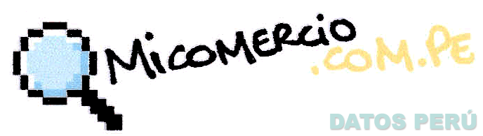 El logotipo conformado por la denominación MICOMERCIO.COM.PE escrita en letras características y diseño estilizado de una lupa, en colores amarillo, celeste, negro y blanco; conforme al modelo adjunto