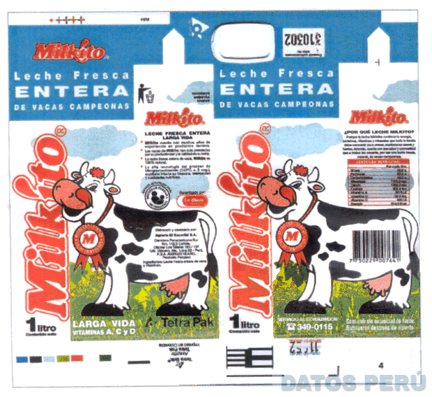 LA DENOMINACION MILKITO, EN LETRAS CARACTERISTICAS, DENTRO DE UN EMPAQUE DE FORMA RECTANGULAR QUE PRESENTA EL DISEÑO ESTILIZADO DE UNA VACA SOBRE UN PAISAJE RURAL FORMADO POR NUBES Y PASTO, TODO EN LOS COLORES CELESTE, BLANCO, ROJO, NEGRO Y VERDE, CONFORME AL FACSIMIL ADJUNTO