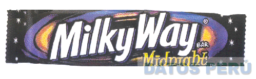 LA DENOMINACION MILKY WAY MIDNIGHT ESCRITA EN LETRAS CARACTERISTICAS, DENTRO DE UNA ETIQUETA RECTANGULAR CON FONDO FORMADO POR UNA FIGURA ELIPTICA Y DISEÑOS DE ESTRELLAS, TODO EN LOS COLORES NEGRO, LACRE, AZUL, AMARILLO, VIOLETA Y BLANCO; CONFORME AL MODELO ADJUNTO