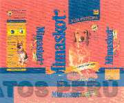 La etiqueta que contiene la denominación MIMASKOT escrita en letras características y la figura de un perro estilizado y debajo dentro de una franja conteniendo la frase VARIEDAD CARNES Y CEREALES escrita en letras características y un pote de comida, granos, carne, cereales, maíz, en la parte superior dentro de una figura geométrica se aprecia la frase ALTA PROTEINA escrita en letras características y a la izquierda un rectángulo conteniendo la figura de un perro estilizado y palabras alusivas al producto, sólo reivindicando lo escrito; todo en los colores azul, anaranjado, rojo, caramelo, amarillo, negro; conforme al modelo adjunto