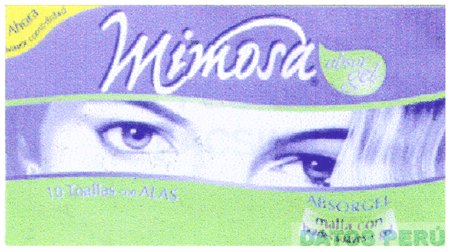 LA ETIQUETA DIVIDIDA EN TRES PARTES POR DOS LINEAS HORIZONTALES LEVEMENTE ONDULADAS EN CUYA PARTE SUPERIOR SE APRECIA LA DENOMINACION MIMOSA ABSOR GEL ESCRITA EN LETRAS CARACTERISTICAS EN UN FONDO COLOR MORADO (PANTONE 2577C) Y EN EL ANGULO SUPERIOR IZQUIERDO UNA FIGURA TRIANGULAR DE FONDO AMARILLO; EN EL CENTRO LA CARA DE UNA MUJER DONDE APARECEN LOS DOS OJOS EN LOS COLORES MORADO Y BLANCO Y LA PARTE INFERIOR DE COLOR VERDE CLARO; CONFORME AL MODELO ADJUNTO,