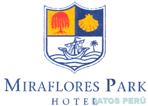 El logotipo conformado por la figura de un escudo de tres cuerpos, en cuya parte superior izquierda se encuentra la figura de un árbol; en la parte superior derecha la figura de una concha y en la parte inferior la figura de un barco navegando, debajo la denominación MIRAFLORES PARK HOTEL escrita en letras características, todo en los colores azul, rojo, mostaza y blanco; conforme al modelo adjunto