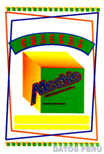 El logotipo constituido por el diseño de un cubo con la denominación MOCHIC escrita en letras estilizadas encerradas dentro de dos líneas rectangulares con las figuras de cubos pequeños en la combinación de colores verde, rojo, amarillo y azul, conforme al modelo adjunto