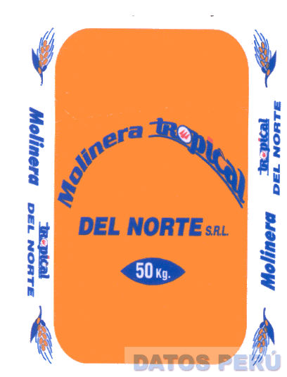 LA ETIQUETA RECTANGULAR DE FONDO ANARANJADO CONFORMADA POR LA DENOMINACION MOLINERA TROPICAL DEL NORTE S.R.L. ESCRITA EN LETRAS CARACTERISTICAS EN LOS COLORES AZUL Y ROJO, CON CUATRO ESPIGAS A LOS EXTREMOS SEGUIDO DE LA DENOMINACION MOLINERA TROPICAL DEL NORTE EN LOS COLORES AZUL Y ROJO; CONFORME AL MODELO ADJUNTO