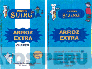 La etiqueta conformada por dos espacios en los cuales se aprecia la denominación MOLINO SUING escrita en letras características dentro de una figura rectangular con bordes redondeados y en cada lado la representación caricaturizada de un grano de arroz con una medalla y de un chino, y diversas frases alusivas al producto, sin reivindicar colores; conforme al modelo adjunto