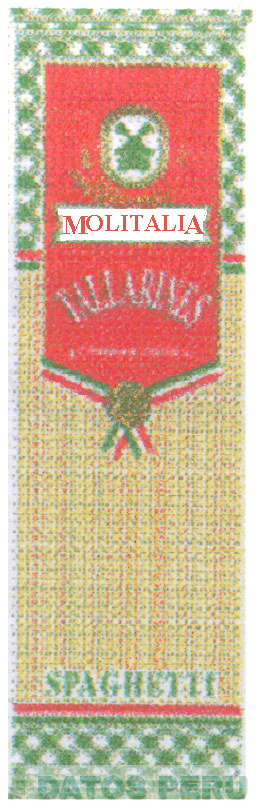EL LOGOTIPO CONFORMADO POR LA DENOMINACION MOLITALIA ESCRITA EN LETRAS CARACTERISTICAS DE COLOR ROJO DENTRO DE UNA FRANJA DE COLOR BLANCO Y BORDES VERDES, SOBRE UN FONDO DE COLOR ROJO DE FORMA IRREGULAR CON LA FIGURA DE UN MOLINO ESTILIZADO ENCERRADO EN UNA FIGURA OVOIDE; EN LOS EXTREMOS SUPERIOR E INFERIOR ZONAS QUE ASEMEJAN UN MANTEL A CUADROS EN COLORES ROJO Y VERDE; CONFORME AL MODELO ADJUNTO,