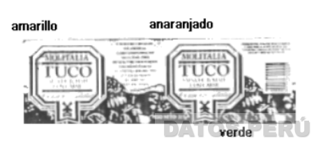 La etiqueta de fondo anaranjado con dos figuras en forma octogonal con bordes blanco, rojo, blanco y verde, con fondo amarillo. En su interior las palabras MOLITALIA, TUCO, SALSA DE TOMATE CON CARNE y la frase COMO EN ITALIA, según modelo adjunto