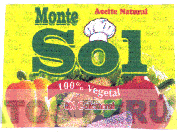 El logotipo conformado por la denominación MONTE SOL escrita en letras características, sobre la letra O de la palabra SOL se aprecia un gorro de cheff; las frases ACEITE NATURAL 100% VEGETAL y 0% COLESTEROL (todas ellas sin reivindicar) escrita en letras características; en la parte inferior se aprecian diversas figuras características de frutas; todo en los colores de amarillo (pantone yellow C), negro (pantone), verde (pantone 348C), rojo (pantone 485 C); conforme al modelo