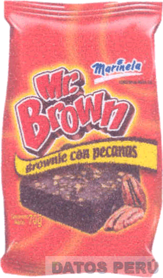 La envoltura conformada por las denominaciones MR. BROWN, MARINELA y entre líneas onduladas BROWNIE CON PECANAS escrita en letras características y figuras estilizadas de un keke (brownie) y dos pecanas, todo en la combinación de colores rojo, anaranjado, amarillo, marrón, azul y blanco; conforme al modelo adjunto