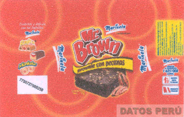 La envoltura desplegada conformada por las denominaciones MR. BROWN, MARINELA, MANKEKE y entre líneas ondulada BROWNIE CON PECANAS escrita en letras características y figuras estilizadas de un keke (brownie) y dos pecanas, todo en la combinación de colores rojo, amarillo, marrón, azul y blanco; conforme al modelo adjunto