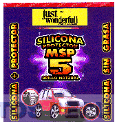El logotipo conformado por la denominación JUST WONDERFULL POWER FRAGANCE escrita en letras características dentro de una figura rectangular y debajo la denominación SILICONA PROTECTOR MSP 5 BRILLO NATURAL escrita de manera característica y la representación estilizada de una camioneta y dos figuras circulares que contienen la imagen de una llanta y el tablero de un automóvil; al lado izquierdo se observa la denominación SILICONA + PROTECTOR y al lado derecho SILICONA SIN GRASA ambas escritas en letras características, todo en los colores amarillo, rojo, negro, blanco, lila, morado, anaranjado, plomo; conforme al modelo adjunto
