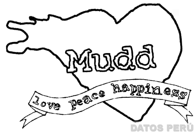 La denominación MUDD escrita en letras características, dentro de una figura irregular, y la frase LOVE PEACE HAPPINESS dentro de una cinta ondulante; conforme al modelo adjunto