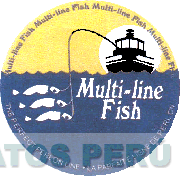 LA DENOMINACION MULTI-LINE FISH ESCRITA EN LETRAS CARACTERISTICAS, SOBRE ELLA LA REPRESENTACION ESTILIZADA DE UN BARCO ARROJANDO UN ESPINEL CON TRES PECES AL LADO INFERIOR IZQUIERDO, EN LA PARTE SUPERIOR SE APRECIA LA DENOMINACION MULTI-LINE FISH EN FORMA REPETITIVA Y EN LA PARTE INFERIOR LA FRASE THE PERFECT PERLON ON LINE - LA PARFAITE LIGNE DE PERL ON, TODO EN LOS COLORES AZUL, AMARILLO, NEGRO Y BLANCO; CONFORME AL MODELO ADJUNTO