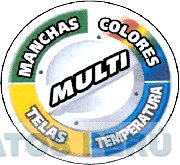La etiqueta representada por una figura circular que contiene en la parte central la denominación MULTI (sin reivindicar) escrita en letras características, alrededor se aprecian las palabras MANCHAS, COLORES, TELAS, TEMPERATURA (sin reivindicar ninguna de tales palabras) escrita en letras características, además en el centro se aprecian cuatro puntos alrededor de la denominación MULTI, todo en los colores verde, amarillo, celeste, rojo, azul y blanco; conforme al modelo adjunto