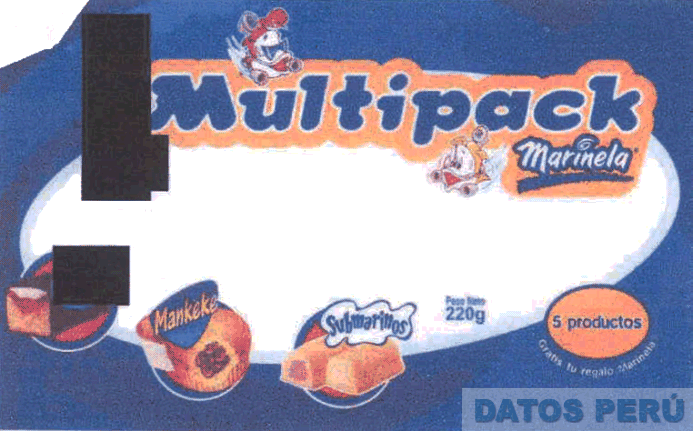 La etiqueta conformada por la denominación MULTIPACK MARINELA, MARIKEKE y SUBMARINOS escrita en letras características en la parte superior la figura estilizada de unos submarinos humanizados y en la parte inferior la figura de dulces rellenos, en los colores rojo, blanco, azul, anaranjado, celeste, marrón y negro; conforme al modelo adjunto