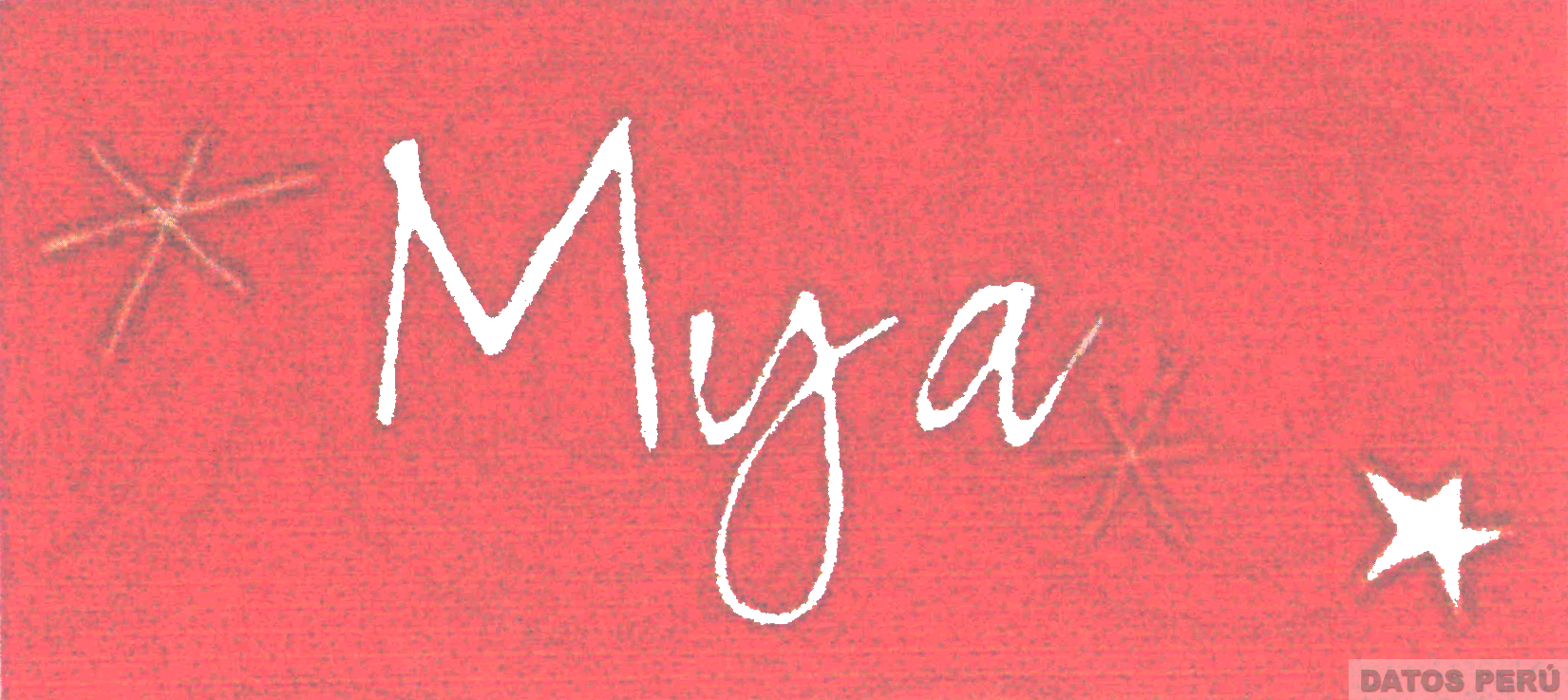 El logotipo conformado por la etiqueta de forma rectangular conteniendo la denominación MYA escrita en letras características, en las esquinas se aprecian las figuras de estrellas, todo en los colores rojo y blanco; conforme al modelo adjunto