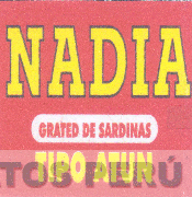 El logotipo conformado por la denominación NADIA escrita en letras características de color amarillo con bordes de color negro, debajo dentro de un rectángulo de color blanco con bordes ovalados la frase GRATED DE SARDINAS escrita en letras características de color rojo, todo sobre fondo de color rojo, en la parte inferior las palabras TIPO ATÚN escritas en letras características de color amarillo, todo sobre fondo de color rojo; conforme al modelo adjunto