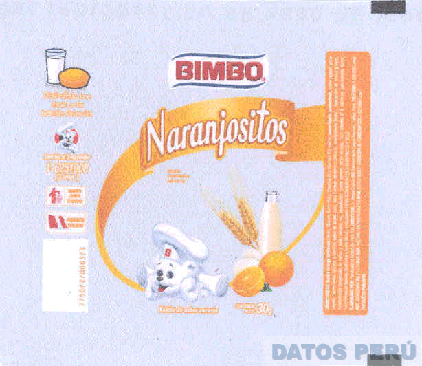 La envoltura desplegada conformada por las denominaciones NARANJOSITOS y BIMBO escritas en letras características y figuras de un osito cocinero echado, una naranja y media, una botella de leche, dos espigas, dos huevos, un vaso de leche y un keke, todo en la combinación de colores anaranjado, amarillo, gris, blanco, rojo y azul; conforme al modelo adjunto