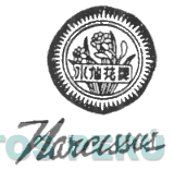 La etiqueta con la denominación NARCISSUS, la figura muestra un ramo de flores con cuatro letras chinas ubicada en la parte media inferior, todo encerrado en un círculo dentado exterior. En la parte inferior del círculo lleva la marca; conforme al modelo adjunto