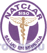 El logotipo conformado por el diseño estilizado de un escudo con una serpiente enrollada en un bastón y la denominación NATCLAR SISO SALUD EN MINERIA escrita en letras características; todo en los colores morado, blanco y dorado; conforme al modelo adjunto
