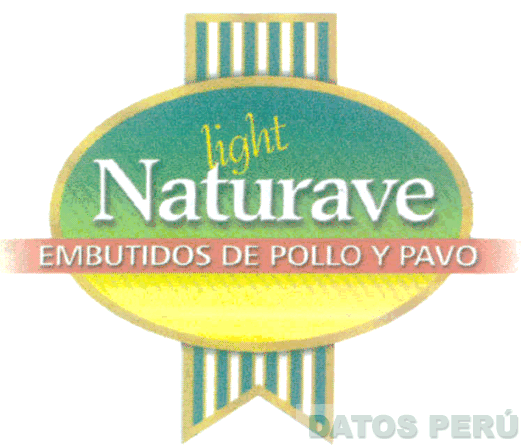 EL LOGOTIPO CONFORMADO POR LA DENOMINACIÓN NATURAVE LIGHT DENTRO DE UNA FIGURA CON FORMA OVOIDE, Y LA FRASE EMBUTIDOS DE POLLO Y PAVO DENTRO DE UNA FRANJA Y DEBAJO DE TODO LA FIGURA DE UNA CINTA, EN LOS COLORES VERDE, AMARILLO, BLANCO, ROJO Y DORADO; CONFORME AL MODELO ADJUNTO