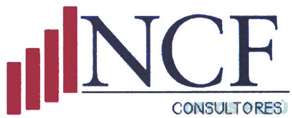 El logotipo conformado por la denominación NCF escrita en letras características de color azul oscuro; en la parte izquierda se aprecian cuatro figuras geométricas rectangulares alargadas que van acrecentando de tamaño, en color rojo y en la parte inferior se aprecia una línea alargada color azul oscuro, bajo la cual se aprecia la denominación CONSULTORES escrita en letras características, de color azul oscuro; conforme al modelo adjunto