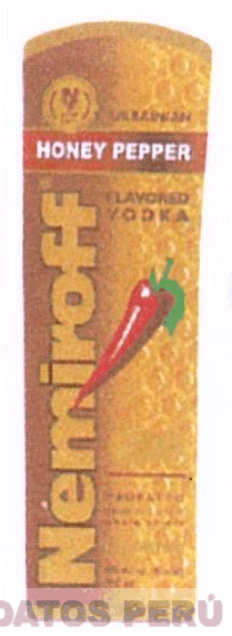 La etiqueta conformada por la denominación NEMIROFF HONEY PEPPER escrita en letras características en donde la denominación HONEY PEPPER se encuentra dentro de una franja, en la parte superior se aprecia una medalla y la denominación UKRAINIAN escrita en letras características, en la parte central se aprecian las representaciones estilizadas de un pimiento, tres medallas y una línea recta horizontal, todo en un fondo irregular en cuyo margen derecho se aprecia la representación estilizada de hexágonos, además de frases alusivas al producto sin reivindicar, todo en la combinación de colores dorado, amarillo, rojo en diversas tonalidades, blanco, verde, negro y marrón en diversas tonalidades; conforme al modelo adjunto
