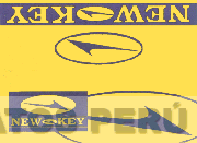 La etiqueta dividida en dos campos en ambos se aprecia la denominación NEW KEY escrita en letras características y figuras ovaladas, dentro de ellas se aprecian figuras geométricas irregulares que se asemejan a un arpón en los colores morado y amarillo; conforme al modelo adjunto
