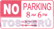 La etiqueta conformada por la denominación NO PARKING escrita en letras características, la palabra NO se aprecia dentro de una figura cuadrangular pequeña, en la parte central se aprecian los números 8 AM, 6 PM en forma característica y la frase MON THRU FRI escrita en letras características; en la parte inferior se aprecia una flecha en doble sentido, todo dentro de una figura rectangular en colores blanco y rojo; conforme al modelo adjunto
