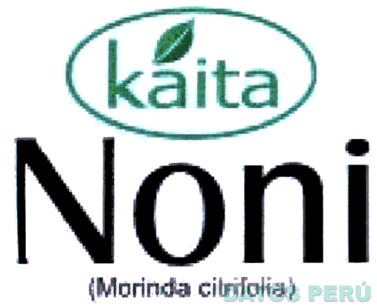 El logotipo conformado por la denominación NONI escrita en letras características de color negro, en la parte superior se aprecia la denominación KAITA con una hoja sobre la letra A todo dentro de una figura ovalada de color verde y en la parte inferior se aprecia la denominación MORINDA CITRIFOLIA entre paréntesis y en color negro; conforme al modelo adjunto