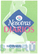 La etiqueta rectangular conteniendo la figura estilizada de una mujer sobre la cual se consiga una figura romboide dentro de la cual se inserta la denominación NOSOTRAS escrita en letras características y una circunferencia con la figura estilizada de una flor, sobreponiéndose sobre aquella la denominación DIARIOS escrita en letras características, consignándose en su parte inferior la denominación NORMAL escrita en letras características dentro de un rectángulo, así como el diseño estilizado de una toalla higiénica con figuras diversas, al lado de un rectángulo con la frase ESTUCHE DESPEGAFACIL escrita en letras características, debajo la cual se consigna una sucesión de franjas horizontales de tamaño diverso; todo en los colores azul (pantone 072), blanco, rosado (pantone rhodamine), celeste, lila y verde en distintas tonalidades; conforme al modelo adjunto