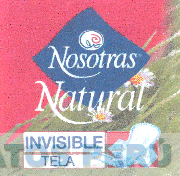 La etiqueta cuadrangular conteniendo la representación de ramas de plantas y flores, apreciándose una figura geométrica de bordes irregulares, en el cual se observa una figura ovalada con el diseño de una flor y la denominación NOSOTRAS escrita en letras características, debajo la denominación NATURAL escrita en letras características, en la parte inferior se aprecian dos franjas horizontales y paralelas con las palabras INVISIBLE y TELA escrita en letras características y una figura cuadrangular conteniendo el diseño estilizado de una toalla sanitaria, en los colores rojo, verde, blanco, azul y amarillo; conforme al modelo adjunto