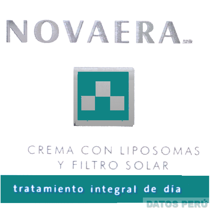 EL LOGOTIPO CONFORMADO POR LA DENOMINACION NOVAERA ESCRITA EN LETRAS CARACTERISTICAS, CUYA LETRA O CONTIENE UNA TILDE DE FORMA CARACTERISTICA; DEBAJO DE ELLA SE APRECIA UN CUADRADO EL CUAL CONTIENE LA FIGURA DE TRES CUADRADOS QUE SE INTERSECTAN, ASI COMO LA FRASE CREMA CON LIPOSOMAS Y FILTRO SOLAR ESCRITA EN LETRAS CARACTERISTICAS Y EN LA PARTE INFERIOR APARECE UNA FRANJA HORIZONTAL QUE CONTIENE LA FRASE TRATAMIENTO INTEGRAL DE DIA, TODO EN LOS COLORES VERDE, BLANCO Y PLATEADO, CONFORME AL MODELO ADJUNTO