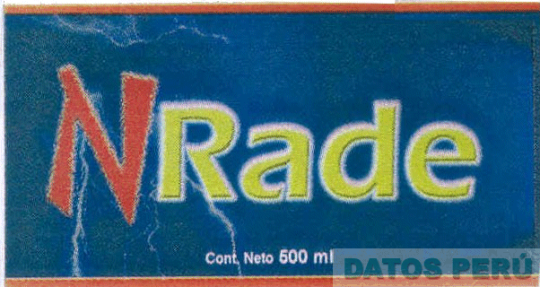La etiqueta de forma rectangular que contiene la denominación NRADE escrita en letras características, en el fondo se aprecian una líneas de forma irregular y en los extremos se aprecian unas líneas horizontales y la frase CON. NETO 500 ML (sin reivindicar), todo en los colores gris, azul, rojo y verde; conforme al modelo adjunto