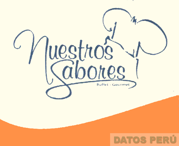 El logotipo conformado por el diseño estilizado de un gorro de chef y la denominación NUESTROS SABORES BUFFET-GOURMET escrita en letras características de color azul sobre un fondo de color beige y en la parte inferior el diseño de una onda en color anaranjado; conforme al modelo adjunto