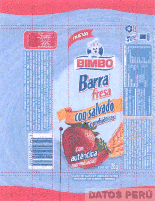 El envoltura conformada por la denominación NUEVA (sin reivindicar) dentro de una cinta ondulante, y la denominación BIMBO escrita en letras características entre dos líneas ondulantes y sobre la misma la figura estilizada de un oso con gorro; asimismo se aprecia la denominación BARRA FRESA escrita en letras características, y la frase CON SALVADO (sin reivindicar) sobre una línea ondulante y PREBIOTICOS (sin reivindicar); en la parte inferior la denominación CON AUTENTICA MERMELADA (sin reivindicar) sobre las figuras de unas fresas y unas espigas, y demás leyendas alusivas al producto (sin reivindicar), en los colores rojo, celeste, blanco, rojo, azul, verde; conforme al modelo adjunto