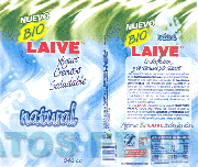 La etiqueta que tiene un fondo de color verde con pincelazos de color blanco, y debajo un fondo de color blanco y celeste, simulando la caída del yogurt; en la parte superior aparece la palabra NUEVO escrita en letras características de color blanco con bordes verdes; debajo, dentro de una figura característica en color amarillo la palabra BIO escrita en letras características de color verde; seguida de la denominación LAIVE escrita en letras características de color rojo con bordes blancos, debajo la denominación YOGURT CREMOSO SALUDABLE escrita en letras características de color azul y en la parte inferior la palabra NATURAL escrita en letras características de color celeste con bordes azules, a la derecha aparece la información relacionada con el producto; conforme al modelo adjunto