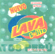 La etiqueta que contiene la denominación NUEVO LAVA SOLITO escrita en letras características en la cual la letra O está formada por la figura de un sol, en la parte superior de la etiqueta se aprecia la denominación DETERGENTE EN POLVO escrita en letras características, así como las figuras de limones en cuya parte superior se aprecia la denominación LIMÓN escrita en letras características y burbuja flotando en cuya parte inferior se aprecia la denominación ULTRA RAPIDO escrita en letras características en los colores verde, rojo, azul, amarillo y blanco; conforme al modelo
