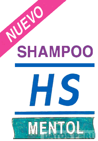 La denominación NUEVO SHAMPOO HS mentol escrita en letras características en donde las letras HS se encuentran inscritas entre dos líneas paralelas; todo en los colores azul, verde, morado y fucsia; conforme al modelo, sin reivindicar los términos NUEVO, SHAMPOO Y MENTOL