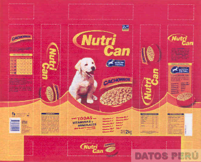 La etiqueta conteniendo la denominación NUTRI CAN escrita en letras características, dentro de una figura irregular la frase NUTRICION TOTAL escrita en letras características (que se repite varias veces), la figura estilizada de un perro, dentro de una franja la denominación CACHORROS escrita en letras características y recipientes con cereales, información alusivas al producto sin reivindicar, todo en los colores rojo, blanco, azul, amarillo; conforme al modelo adjunto