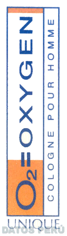 La etiqueta rectangular de orientación vertical dividida en dos franjas verticales conteniendo la denominación 02=OXYGEN escrita en letras características y la denominación UNIQUE consignada horizontalmente al pie de la etiqueta sin reivindicar la frase COLOGNE POUR HOMME, todo en los colores azul (pantone 655 C) y anaranjado (pantone 1505C); conforme al modelo adjunto