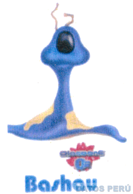 La figura de un personaje característico, al lado derecho la denominación OLOCOONS O2 escrita en letras características sobrepuesta a un diseño característico, y debajo de dichas denominaciones se aprecia la denominación BASHAU escrita en letras características, todo en la combinación de colores rojo, azul, negro y amarillo; conforme al modelo adjunto
