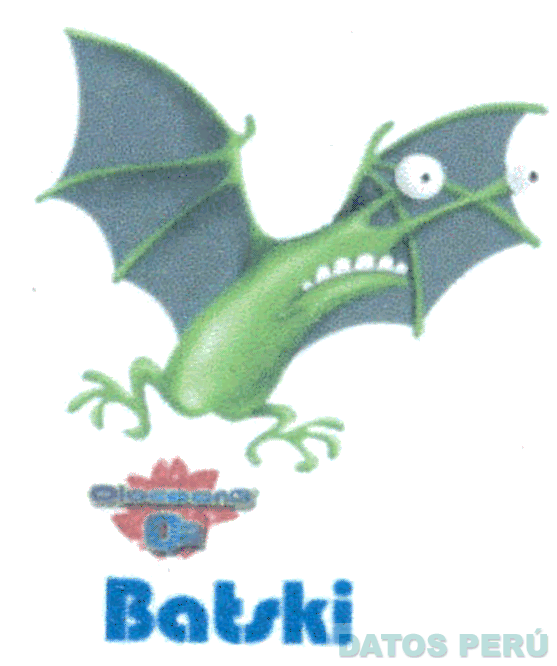 La figura de un personaje característico, al lado izquierdo la denominación OLOCOONS O2 escrita en letras características sobrepuesta a un diseño característico, y debajo de ésta se aprecia la denominación BATSKI escrita en letras características, todo en la combinación de colores verde, blanco, gris, rojo y azul; conforme al modelo adjunto