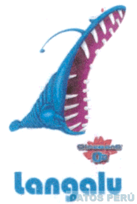 La figura de un personaje característico, al lado derecho la denominación OLOCOONS O2 escrita en letras características sobrepuesta a un diseño característico, y debajo se aprecia la denominación LANGALU escrita en letras características, todo en la combinación de colores rojo, azul, blanco, celeste y morado; conforme al modelo adjunto
