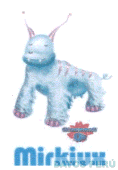 La figura de un personaje característico, al lado derecho la denominación OLOCOONS O2 escrita en letras características sobrepuesta a un diseño característico, y debajo se aprecia la denominación MIRKIUX escrita en letras características, todo en la combinación de colores rojo, azul, blanco, celeste y rosado; conforme al modelo adjunto