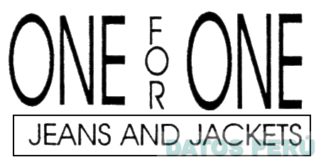 El logotipo conformado por la denominación ONE FOR ONE escrita en letras características; en la parte inferior se aprecia la frase JEANS AND JACKETS escrita en letras características dentro de un rectángulo, todo en los colores blanco y negro; conforme al modelo adjunto
