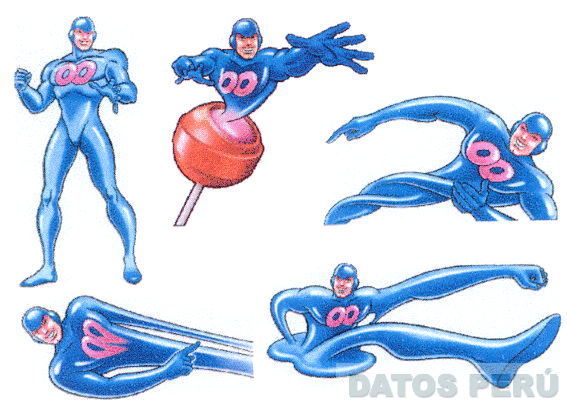 LA REPRESENTACION ESTILIZADA DE UN PERSONAJE ELASTICO TIPO SUPERHEROE CON TRAJE AZUL CON LAS LETRAS OO COLOR ROSADO EN EL PECHO. EL PERSONAJE SE MUESTRA EN CINCO FACETAS DISTINTAS, ESTANDO EN UNA DE ELLAS SALIENDO DE UN CHUPETE COLOR ROJO, ROSADO Y BLANCO, CONFORME AL MODELO ADJUNTO