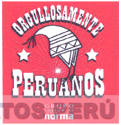 El logotipo conformado por la denominación ORGULLOSAMENTE PERUANOS escrita en letras características, en el centro se aprecia la representación de haces de luz y sobre ella se observa la figura estilizada de un chullo y dos estrellas, en la parte inferior se aprecia la denominación GRUPO EDITORIAL NORMA escrita en letras características, todo en los colores rojo, blanco y negro; conforme al modelo adjunto.